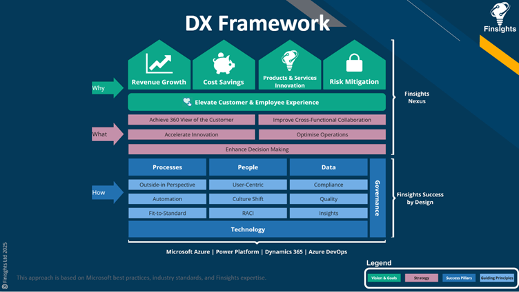 So how do we address these challenges and improve the organisation’s chances of succeeding in its DX journey? It’s important to recognise that while we can increase the likelihood of success, digital transformation can never be fully guaranteed—there are simply too many variables at play. The Finsights DX Framework was developed to tackle these obstacles with a practical, structured approach—focusing on Why, What, and How—as shown in the following diagram.