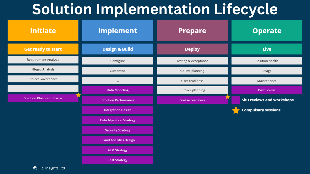 SbD organises the implementation into methodology-agnostic phases and recommends a series of reviews and deep-dive workshops. Two sessions, the Solution Blueprint Review and Go-live Readiness, are mandatory. These checkpoints enable critical discussions, risk assessments, and validation of best practices. They also ensure timely alignment with project milestones and allow early identification of key delivery elements to prevent delays.